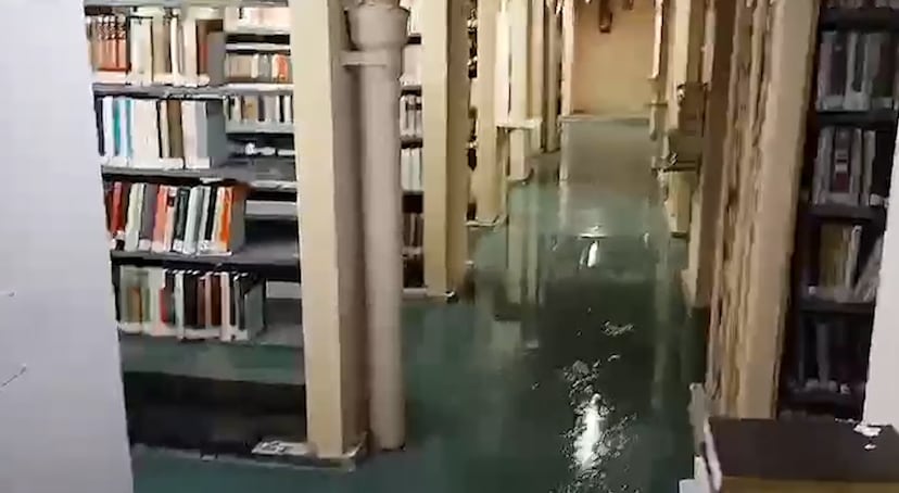 Un vídeo al que ha tenido acceso EL PAÍS muestra el suelo del piso 12º, en el depósito general del edificio, anegado y con agua cayendo por varias goteras. Se han visto afectados un centenar de libros de los años ochenta del pasado siglo