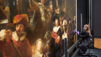 Cinco años después de que el Rijksmuseum de Ámsterdam se embarcara en la “operación La ronda de noche”, la mayor investigación llevada a cabo sobre el famoso cuadro pintado por Rembrandt en 1642, ha llegado el momento de quitar el barniz del óleo. A partir de este martes, un equipo de ocho conservadores limpiarán poco a poco una tela que mide 3,79 metros de largo por 4,36 metros de alto. Lo harán con un tipo especial de tejido para evitar daños en el lienzo. La restauración, que preservará el cuadro para el futuro, podrá seguirse en directo, pues los trabajos se realizarán a la vista del público. La obra está en una urna de cristal abierta por arriba, instalada en el museo en 2019, que la ha protegido de microclimas dañinos para los pigmentos durante la fase previa de investigación.
