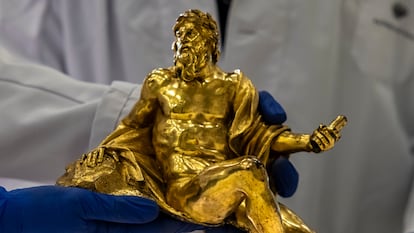 El río Ganges ha vuelto a la Fuente de los cuatro ríos. Este críptico titular resume la historia de la recuperación de una pequeña escultura expoliada, obra del genial artista napolitano Gian Lorenzo Bernini (1598-1680), que reapareció en una casa de subastas de Barcelona en noviembre de 2021 y que, desde hoy, jueves, ha regresado a su espacio original. La figura, de 26 centímetros de alto por 24 de ancho, en bronce, representa al gran río de la India y ya puede contemplarse dentro del conjunto de la Fuente de los cuatro ríos, en la planta dedicada a los Austrias, en la Galería de las Colecciones Reales (Madrid). Aunque hay varias teorías, parece que esta fuente fue un regalo del papa Inocencio X al rey español Felipe IV, quien colocó este elemento decorativo en su despacho en el Alcázar madrileño a mediados del siglo XVII.
