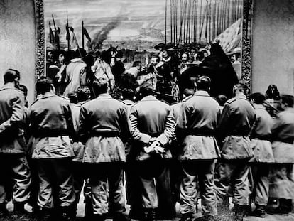 Otra curiosidad en una de las vitrinas es “la hoja de contactos de Charlton Heston”, explica ella, en la que se ve al actor quitándose la armadura de caballero durante el rodaje de El Cid en España para darse un chapuzón en una playa. En los contactos, Masats escribió “los números del orden que debían seguir las fotos, como en una secuencia cinematográfica; pero ese orden no correspondía con el que había hecho las fotos”. Señal de que ya pensaba en lo que era entonces un nuevo medio, la televisión, y en el cine.