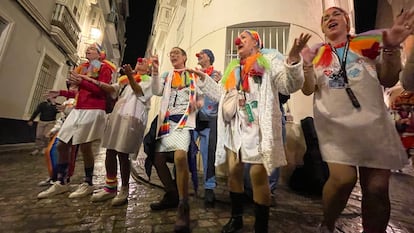 Conforme pasan los días en el Carnaval de Cádiz, el pijama de hospital con el que Carlota Tormes se caracteriza para su chirigota callejera está cada vez más tuneado. La noche del miércoles ya tiene buena parte de la delantera y el costado llenos de nombres y hasta usuarios de X. “Son gente que está pasando el cáncer o que no lo ha superado”, aclara. No hace ni dos meses que Tormes concluyó su último ciclo de quimioterapia y radioterapia para superar el cáncer de mama y ahí está, cantando en la intersección de dos calles del centro: “¡Fuera pañuelo! Adiós al rosa que, aunque nos guste, parecemos las Muñecas de Famosa. ¡Caigan los miedos con sus cadenas y dejen paso a una vida nueva!”.
