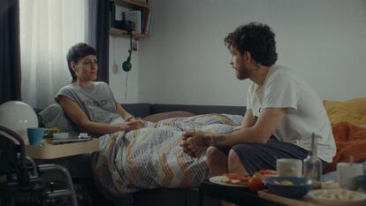 En la primera historia, con el encuentro entre la documentalista que ha quedado impedida temporalmente en silla de ruedas tras un accidente y el prometedor músico que se plegó al dinero fácil, se articula ya el simbolismo del desayuno como cumbre de la complicidad en pareja. Él, romántico, directo, emotivo, mensajero de canciones con las que compartir sensibilidades, le hace un zumo de naranja a ella tras una noche de sexo y la apremia porque “si no se le irán las vitaminas”. Ella, descreída, cliché con patas contra cualquier ternura, no se sabe si dolida, gangrenada o plenamente convencida de la mierda de la vida en pareja, lo acaba despidiendo de casa porque las mañanas no le interesan, solo las noches. De hecho, el personaje de ficción se aproxima al formato documental del modo más erróneo posible: con la teoría ya compuesta; buscando voces que se la confirmen en pantalla. No quiere entender el desamor, solo quiere que le aseveren que el amor es el desastre. Y no entiende que eso no es un documental, sino un panfleto.