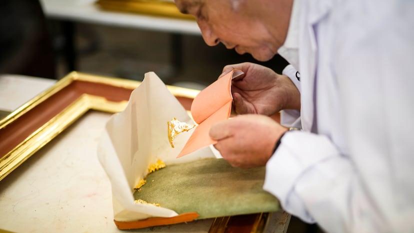 Lucio Maire abre un librillo de oro, de apenas unos centímetros, entre cuyas hojas se intercalan 25 panes de oro de 22 quilates. Como el material es tan fino y delicado, no puede cogerlo con las manos, así que lo sopla y el pan de oro vuela hasta depositarse en una almohadilla llamada plomazón. El restaurador lo corta ahí. Luego, se pasa por el carrillo una brocha (una polonesa) “para que esta coja un poquito de grasa y de electricidad estática”, dice. Al acercar la polonesa al pan de oro, este se adhiere y así puede aplicarlo sobre el marco de un cuadro que está dorando y sobre el que ha apli...
