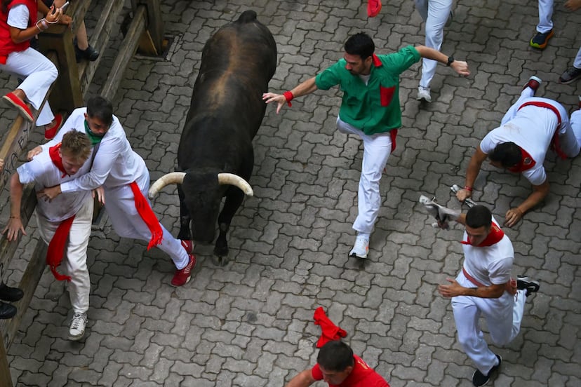 Todo comenzó tras el primer cohete de la mañana, que no cogió desprevenidos a los animales, despiertos y nerviosos desde el amanecer. De nuevo, los mastodónticos cabestros salieron los primeros y enfilaron la Cuesta de Santo Domingo como consumados y aguerridos atletas. Pero pronto cambiaron las tornas: no había llegado la manada al final de la calle cuando un toro de capa negra tomó la delantera y le siguió un hermano colorao; y como si aquello fuera una señal para toda la familia, otro más se le unió en la bajada de Mercaderes y, al final, toda la manada completa ―los bueyes también tienen su orgullo― llegó compacta a la curva que da paso a Estafeta. Pero no hubo encontronazo contra los duros tablones, y se notó el efecto del líquido antideslizante o, quizá, la pericia de los toros.