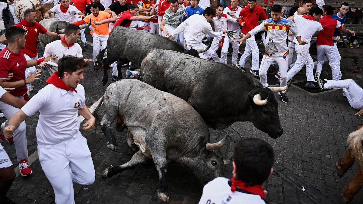 Todos juntos bajaron a toda velocidad por Mercaderes, salvaron el encontronazo con los tablones de la curva de Estafeta, y, a duras penas, emprendieron la carrera entre una multitud que, por momentos, llegó a ocultar a toros y cabestros, que avanzaban entre atropellos y caídas.