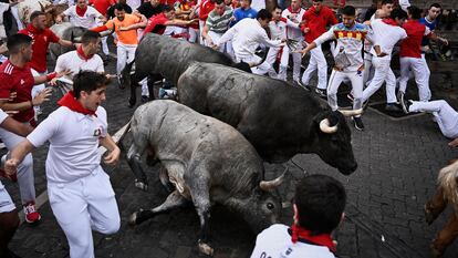 Sexto encierro de San Fermín | Multitudinario, emocionante y limpio sexto encierro de los toros de Escolar con el suelo mojado y el cartel de “No hay billetes” en el recorrido