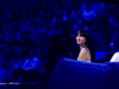 Su carta de presentación de estos tres conciertos (uno en Barcelona y dos en Madrid, con todo vendido) ha sido 6 de febrero. Aquella canción que mostró por primera vez en febrero, en su documental Metamorfosis. Aquella que su equipo le decía entonces que no servía para abrir en un estadio. No hizo caso, arriesgó y ganó. Solo hicieron falta unos segundos de los acordes para que el público se pusiese en pie. “¡Buenas noches, Madrid!”, gritó feliz. Los asistentes, de todas las edades, enloquecieron: “¡Qué guapa va!”, afirmaba una joven que, de azul, seguía la temática de la noche. No tardó en sonar otro de los éxitos de su último disco, Cuarto Azul: Superestrella. Con una interpretación digna de una diva del pop, los presentes se dejaron la voz coreando cada verso. Y eso que solo era la segunda de la noche.