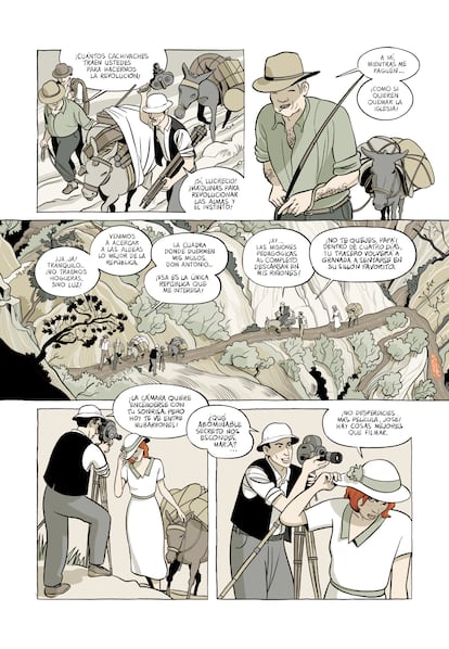 Recuerda Bonet que él, “como le pasa a mucha gente, confundía las misiones con la Barraca”, el teatro universitario de Lorca que tuvo una inspiración y objetivos similares. Guionista y dibujante se pusieron en marcha. El catálogo de la exposición Las Misiones Pedagógicas 1931-1936 que puso en pie la Residencia de Estudiantes en el 75 aniversario de las misiones, en 2006, ha sido, reconocen ambos, una fuente fundamental para su novela gráfica. A la hora de arrancar la historia, Bonet optó por un cómic de trasfondo real y personajes y localizaciones ficticias, aunque el escenario general, las Alpujarras, y algún personaje aquí y allá protagonizaron la historia.
