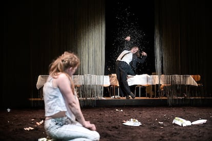 La puesta en escena de Ostermeier sigue impactando como el primer día. Aunque tal vez habría que adjudicársela a medias con Lars Eidinger, el actor que lleva encarnando a Hamlet desde 2008, como reconoció el propio director el viernes en un encuentro con la prensa en Girona: “Es el actual ‘propietario’ del mito. Lo lleva en el alma. Y quiere interpretarlo hasta que muera”. El suyo es un Hamlet bufonesco, que por momentos parece un showman humorístico, alejado de la figura romántica del príncipe torturado por el asesinato de su padre y finge estar loco para llevar a cabo sus planes. Ostermeier y Eidinger lo despojan del tópico —y juegan con él— para presentarlo como un joven egocéntrico, malcriado, misógino, brutal, grosero y artificiosamente gordo. Un tipo corroído por la sed de venganza, que finge estar loco pero que a la vez lo está y que parece capaz de cualquier arbitrariedad. Visto en el contexto social y político actual, podría decirse que es casi visionario.