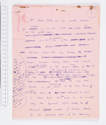 Una de las joyas de la exposición es el manuscrito donde el escritor describe por primera vez a su personaje más conocido, el agente George Smiley. “Bajo, regordete y, en el mejor de los casos, de mediana edad”, recorriendo un Londres lluvioso. “Paticorto, su aire al andar podía ser cualquier cosa salvo ágil…”. Los sucesivos tachones, las anotaciones y correcciones del folio dan una idea del modo en que el autor perseguía la frase perfecta. “Al final, era un escritor. Que creó algunas de las novelas políticas más importantes de la Guerra Fría y del periodo posterior. Era un artista. Quiso contribuir al canon de la literatura inglesa. Por eso no solo investigaba de manera exhaustiva, sino que escribía y reescribía. Yo llegaba a leer hasta seis borradores distintos de cada una de sus novelas”, describe el académico italiano.