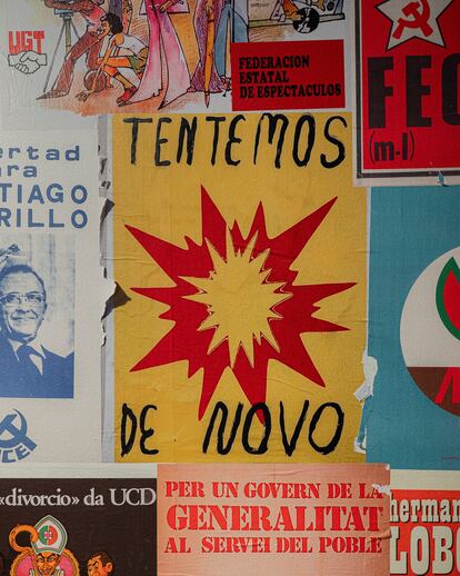 La muestra comienza en una suerte de túnel del tiempo forrado de suelo a techo con cartelería política de los años setenta que se estampó por las calles de España y Portugal. La literalidad de estas imágenes, solo interrumpida por El abrazo de Genovés, da paso a un recorrido no cronológico en el que la alegoría responde a la interpelación directa a través del arte de Joan Miró, Antoni Tápies, Paula Rego, Cristina García Rodero, João Tabarra, entre otros artistas.