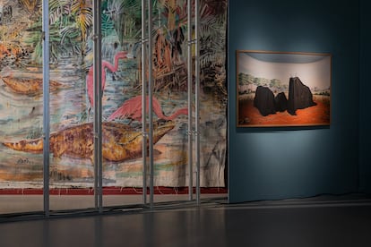 Parte de la colección Portuguesa de Arte Contemporáneo del Estado que se despliega en la exposición “es hija del periodo democrático”, ha apuntado Sandra Vieira Jürgens, una de las comisarias. Las piezas tienen, en muchas ocasiones, una apelación mucho más directa a cómo se llegó a la Revolución de los Claveles, la caída de Salazar, las lecturas poscoloniales y la relevancia de la inmigración como una amenaza. En el caso de las obras de los artistas españoles pertenecientes a la Fundación Montemadrid, Berástegui ha aclarado que complementan la lectura de este periodo desde “la alegoría”. Un ejemplo: La tarde. Campillo de arena 1/7 (1978), foto de García Rodero en la que una mujer se asoma a la ventana enrejada de su casa del pueblo, mientras su marido se sienta libremente en la puerta de su casa, no es solo un retrato de la vida popular tras la muerte de Franco, es la metáfora del encierro de las mujeres que se trata en una de las salas con el afán de que no se deje de hablar de “los derechos humanos y la igualdad”. Y se posiciona frente a la obra sin título de Bárbara Fonte sobre las mujeres de su país.