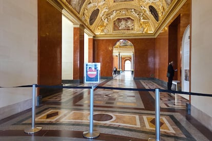 Entre grupos de visitantes de medio mundo y abuelos franceses a cargo de sus nietos en pleno receso escolar, un turista asiático pregunta por la Victoria de Samotracia simulando la ausencia de brazos: su expresividad suple con creces que no hable inglés. Subiendo la escalinata de la diosa alada por el lateral izquierdo, se llega a la galería de Apolo. La entrada está cerrada a cal y canto, sin un cartel que lo explique. “No hacen falta paneles para entender este cierre”, dice un vigilante con cara de pocos amigos, dedicado a impedir, con éxito desigual, que los visitantes hagan fotos a esa entrada. Frente a la puerta monumental, impecablemente restaurada “gracias a Total”, como recuerda un rótulo —patrocinio que dialoga incómodamente con la historia de extracción colonial que rodea a estas joyas reales—, el flujo llega a oleadas cada media hora. A las 9.30, 10.00 y 10.30, según los horarios de las entradas precompradas, obligatorias para acceder al museo. Se arremolinan en grupos pequeños, descubren el cierre y entienden, de golpe, que todo sucedió aquí.