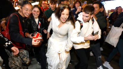 Llámenlo acto de fe. Quienes peregrinaron la noche del pasado lunes a la madrileña plaza de Callao esperaban un mensaje divino. Y lo encontraron: envuelta en su blanca pulcritud y ascendida por las masas, santa Rosalía, patrona del pop español, alumbró el camino a seguir para cualquiera que quiera liberarse de los dictados terrenales en la industria musical. Bajo un manto mesiánico, desató la mística para hallar la luz promocional y evitar los infiernos del olvido en la era de la sobreinformación. De entre las infinitas plegarias atendidas online, el influencer Alex Sinos daba en el clavo: “Desde hoy, todas las agencias de publicidad intentando vender a los clientes ‘una presentación tipo Rosalía en Callao”. Quizá por eso, para evitar una futura avalancha de superestrellas liándola parda por sorpresa en el centro de Madrid, el Ayuntamiento se precipitó a abrir expediente sancionador a la artista por falta de permisos, con la amenaza de una multa que nadie sabe cifrar exactamente.
