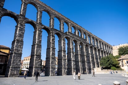 La catedral de Segovia se vislumbra en lontananza desde la campiña donde durante años los romanos obtuvieron el recurso clave para el acueducto. Un equipo de arqueólogos busca hoy sus huellas en el yacimiento. La observación minuciosa de los bloques revela diversidad de tonalidades sobre el gris granito, siendo perceptible que hay macizos intactos desde hace millones de años y otros que se serraron tiempo atrás. Los líquenes también facilitan las pesquisas arqueológicas, así como hendiduras del tamaño de un dedo, señal de que los punzones metálicos de los excavadores se clavaron sobre ellas para, golpeándolas con mazos, romperlos y trasladar los trozos obtenidos a los carros tirados por bueyes rumbo a Segovia. “Dentro del frente de cantera hemos encontrado espacios para yunques, zonas quemadas por las fraguas, restos de esquirlas de metal, varias estructuras para proteger a los animales o zonas de acopio y talleres”, explica la arqueóloga Clara Martín.