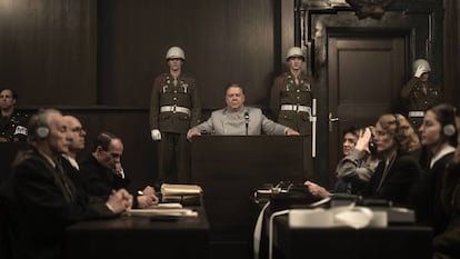 Núremberg, que muestra a Goering en sus horas bajas y finales, desde que cae preso de los estadounidenses (el episodio fue sustancialmente distinto a como muestra la película: su Mercedes iba en un convoy de veinte vehículos con un séquito que incluía más de 50 oficiales de la Luftwaffe) hasta que se suicida para evitar su ahorcamiento tras el famoso juicio, y espero que no se considere esto espóiler, es por fin la gran película sobre el personaje, al cual se le pone, como decía, en el centro de la trama. Para hacerlo, claro, los guionistas —la película está basada en el libro El nazi y el psiquiatra (Ariel, 2015), de Jack El-Hai— han tenido que obviar prácticamente a todos los otros líderes nazis juzgados, exceptuando a un par de los menos interesantes y más bastos (Robert Ley y Julius Streicher) y a Rudolph Hess que total, como estaba loco, han debido pensar, no hace sombra al mariscal del Reich. Esto no significa que Goering no fuera realmente el más importante del grupo de los jerarcas nazis supervivientes: como segundo del régimen y sucesor designado de Hitler (al menos hasta casi el final), desde luego que lo era. Pero es un poco tramposo convertir a los otros veinte procesados —en total eran 22, a Bormann, que nadie sabía dónde estaba (estaba muerto) se lo juzgó en rebeldía—, entre ellos gente tan interesante como Speer, en un simple telón de fondo de la peripecia del Reichsmarshall.