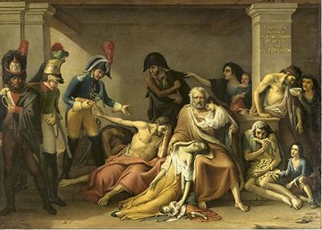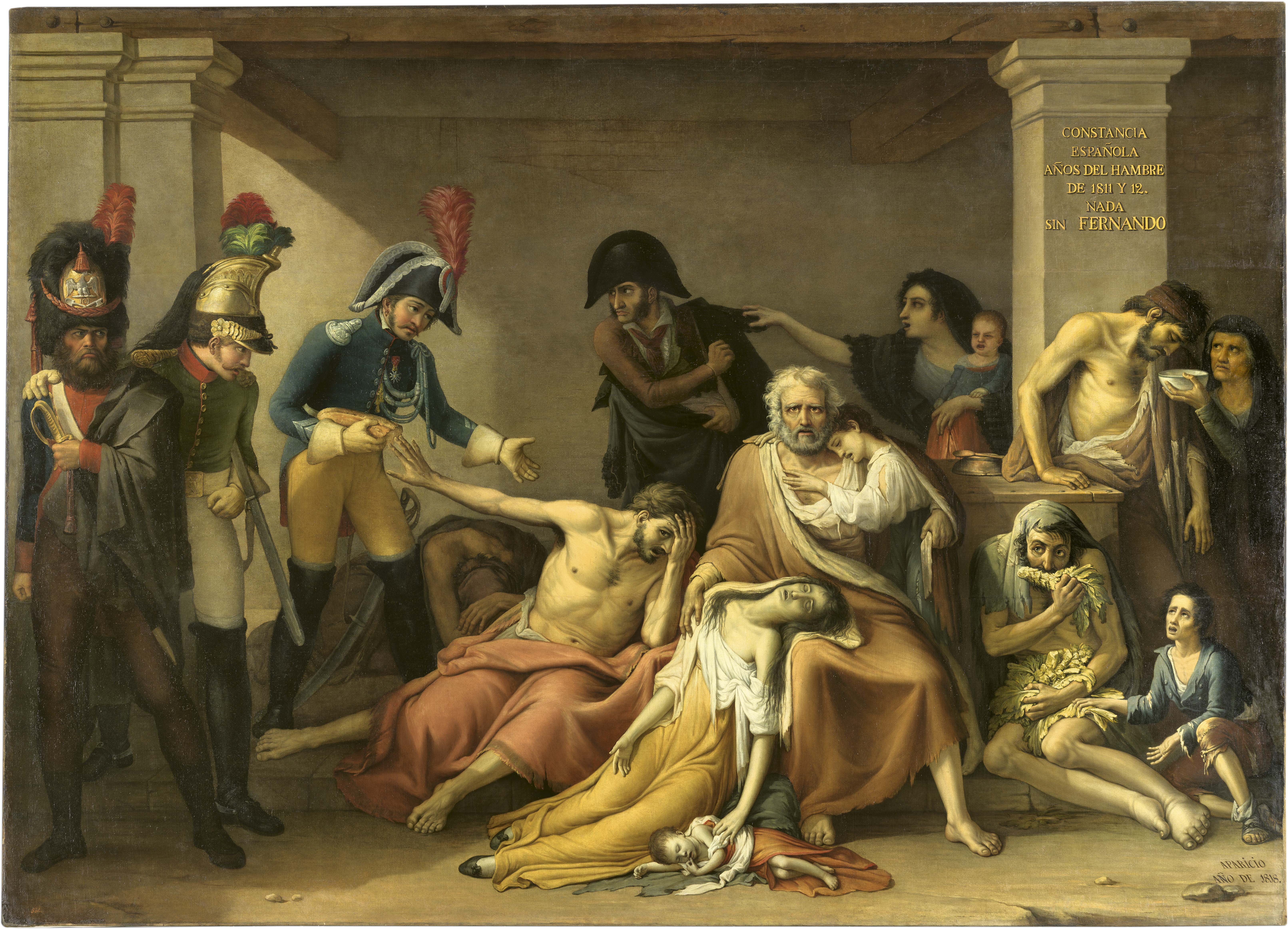 La familia en el centro de la escena simboliza todas las fases del hambre: la hija y el bebé muertos, el padre y otra mujer moribundos y el yerno que rechaza el sustento de los invasores. Los niños funcionan como símbolo de la inocencia sacrificada, similar a la iconografía de la Revolución Francesa.