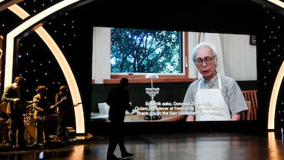 El cineasta recibe el premio Donostia desde Tokio, antes de la proyección de ‘El chico y la garza’, durante la ceremonia de inauguración de la 71ª edición del Zinemaldia