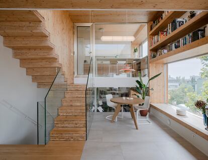 Aunque los ocho pisos de este edificio —una cooperativa de propietarios levantada en Madrid— comparten una rotunda estructura de madera, que permite casi despojarlos de paredes, estos ocho tríplex están hechos a medida. No tuneados, a medida. No acabados al gusto del consumidor, pensados, medidos, planeados para satisfacer al futuro inquilino.