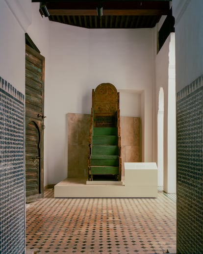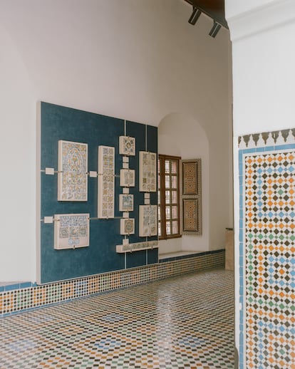 La colección incluye también coranes históricos, astrolabios, instrumentos musicales, alfombras, joyas y una extensa muestra de cerámica local en el característico estilo azul de Fez. Ese podría ser uno de los logros de esta intervención: en medio de una gran suma, los arquitectos aportan orden sin encorsetar lo expuesto, aire para facilitar la convivencia, un paso atrás para que arquitectura y museografía vayan de la mano.