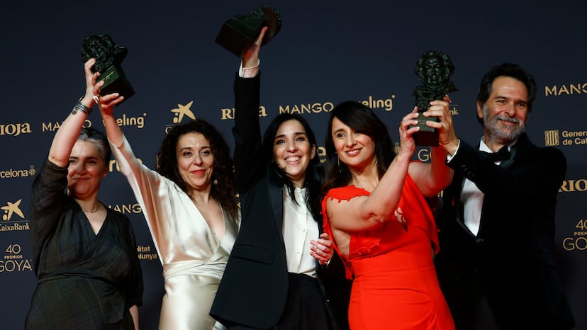 La directora Alauda Ruiz de Azúa y los productores posan con los Goyas a mejor guión original, mejor dirección y mejor película por 'Los domingos', durante la ceremonia de entrega de los Premios Goya en su 40 edición, este sábado en el Auditorio Fórum CCIB de Barcelona. Foto: Quique García (EFE) | Vídeo: EPV