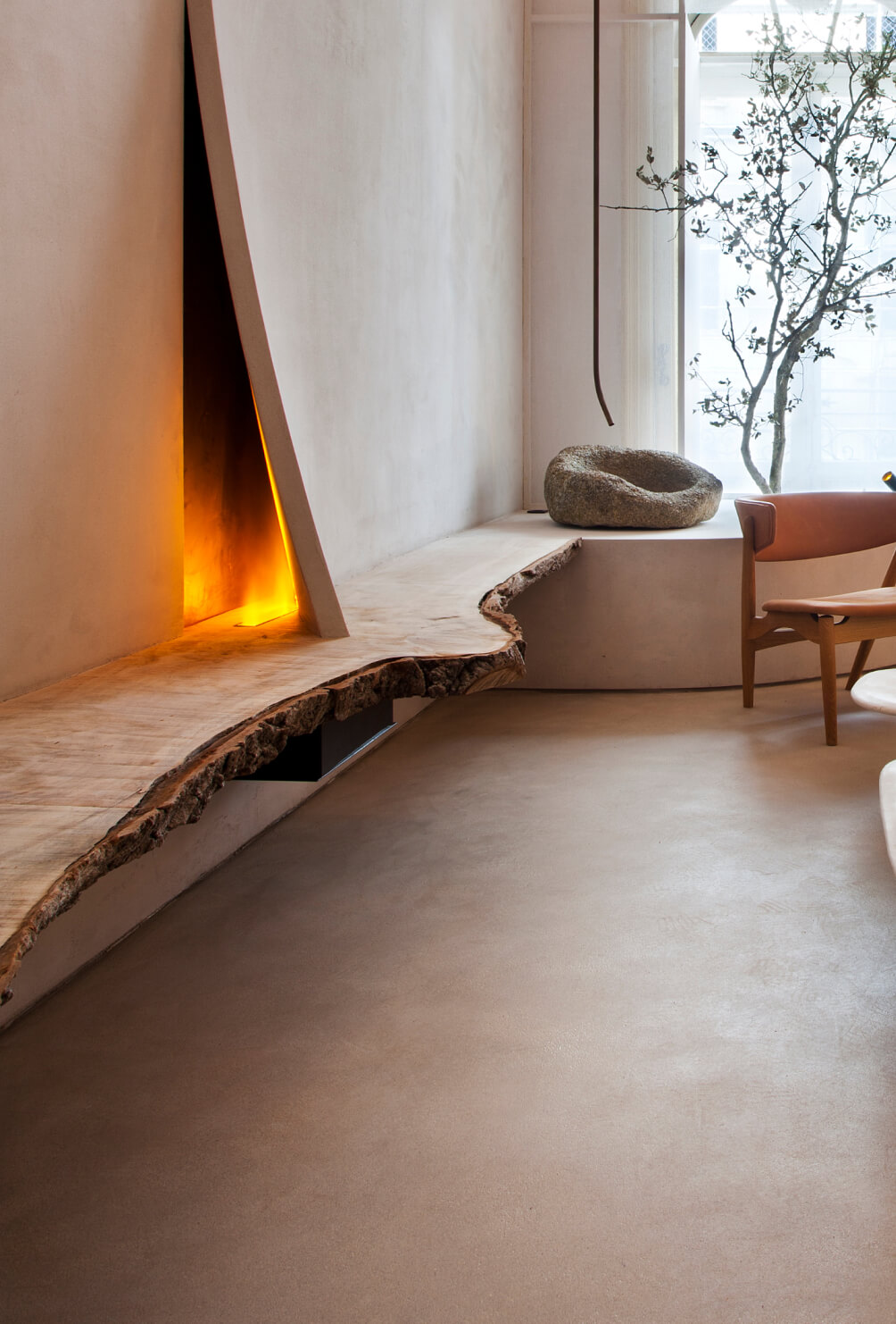 En ‘Topografías del placer’ (izquierda) abrió la pared como un desvelamiento, para dejar ese resquicio al fuego, que invita a la reflexión. Una apuesta que resultó ganadora en Casa Decor 2020 y la propulsó como interiorista. Abajo, dos espacios con el sello del ‘minimalismo cálido’ de De Santos. .