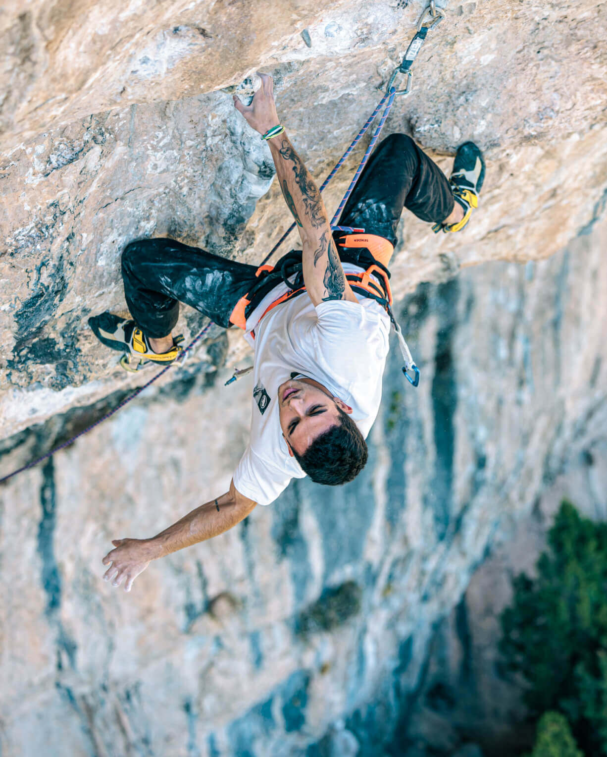 Ginés durante el ascenso de una vía en la roca (2023). Foto: Javi Pec