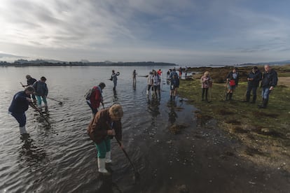 Existe toda una narrativa sobre el mar entre aquellos que han nacido en la costa. Lo echan de menos cuando no lo ven, es algo muy grande. Este sentimiento se acentúa en Charo Oliveira, de 61 años, recientemente jubilada tras medio siglo sacando almejas, berberechos y navajas de la ría de Arousa. Pertenece a la asociación cultural Guimatur, formada por una veintena de mariscadoras en activo y retiradas que organizan excursiones por las mañanas para dar a conocer su oficio. “Echamos de menos el mar, por eso volvemos a verlo cada día”, cuenta en el barrio marinero de Santo Tomé.