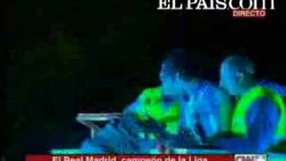 Por fin y tras cuatro años de espera, Raúl ha podido colocar una bandera madridista en lo alto de la estatua de la diosa Cibeles ante los miles de aficionados que han abarrotado los alrededores de la plaza madrileña para celebrar el trigésimo título de Liga blanco. El capitán se ha subido a una grúa y, entre el delirio de miles de personas, ha colocado una bandera con el escudo madridista alrededor del cuello de la estatua, una bufanda blanca y una bandera española. Tras vestir a la diosa, han comenzado algunos incidentes cerca de la fuente. Varios seguidores han comenzado a tirar botellas de agua y bengalas y la policía ha tenido que cargar contra los alborotadores.
