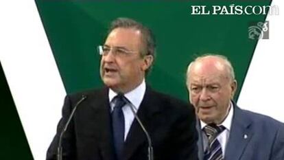 Nadie se maneja de una forma tan cómoda entre las masas como el nuevo presidente del Madrid. Nadie mejor que él sabe como explotar la gallina de los huevos de oro. Es el marketing galáctico hecho persona. De ahí el prime time mundial. De ahí de su capacidad para alternar el énfasis, las pausas y los silencios antes de presentar a Di Stéfano y a Eusebio. "Es muy fuerte todo esto", le susurró el presidente de honor del Madrid a Florentino. De ahí una puesta en escena estudiada hasta el más mínimo detalle para ser retransmitida en directo a todo el mundo. De ahí la carta enviada a la embajada de Portugal para invitar a todos los portugueses. De ahí que se haya puesto ya manos a la obra para amortizar los 94 millones de euros gastados para comprar al futbolista más caro de la historia. En menos de una hora, el club vendió ayer miles de camisetas con el número 9.