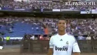Cristiano Ronaldo, el fichaje más caro de la historia del fútbol, se presentó en un estadio Santiago Bernabéu prácticamente lleno luciendo por primera vez la camiseta del Real Madrid con el número nueve a la espalda.Vídeo: AGENCIA ATLAS
