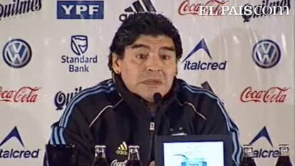 El seleccionador argentino puede ser grotesco o encantador. Pero son sus desaforados arranques autodestructivos los que le han convertido en un negocio el doble de rentable. La prensa argentina está mayoritariamente paralizada por la atracción. La prensa internacional asiste asombrada. Todos acuden a sus apariciones con la esperanza de presenciar un hecho inaudito, incluso a riesgo de sufrir una humillación. Lo que se vio ayer es un hombre harto. Triste. Melancólico, evocó el Mundial de México, el que ganó como jugador, como su modelo a seguir. "Me gustaría ir a Suráfrica de tapado", aseguró, sobre la cita del verano de 2010. "En 1986 nosotros fuimos de tapado. Recuerdo que estaban Brasil, Alemania y España delante nuestro y fuimos los primeros en llegar y los últimos en irnos. Pero hay cosas que uno no puede controlar. Por eso el fútbol es tan lindo".