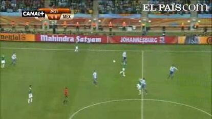 Argentina no encontraba el hilo del partido y sus volantes se confundían de manera tan reiterada que a Messi no le quedó más remedio que recular a la línea de tres cuartos para entrar en juego. Más que el regate de La Pulga se imponía su pase, así que profundizó para Tévez. El ariete forzó la salida del portero y la pelota regresó a Messi. El zurdo la volvió a poner, ahora por arriba, y el ariete la cabeceó a la red en fuera de juego. Aunque la acción no admitía discusión, el árbitro dio gol después de mirar al linier. Las imágenes del videomarcador del estadio dejaron tan en evidencia al auxiliar Stefano Ayroldi, que pidió rectificar a Roberto Rosetti. Imposible cambiar una decisión del colegiado, la peor de las noticias para México, desquiciado por una decisión arbitral.
