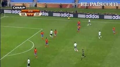 Se presuponía una guerra por el balón pero España desde el primer minuto al noventa y tres dejó claro que los amos del balón eran ellos y dejaron a los alemanes a su merced. España presionó en todo el campo cada vez que perdió el balón e hizo un partido perfecto en este sentido hasta el gol. Alemania, apoyada en un 4-4-1-1 trató de cerrar espacios y salir tocando en todo momento, pero su intento de jugar de tú a tú a la mejor selección de este mundial fue estéril y se pasaron todo el partido buscando sombras alas que presionar o robar el balón.