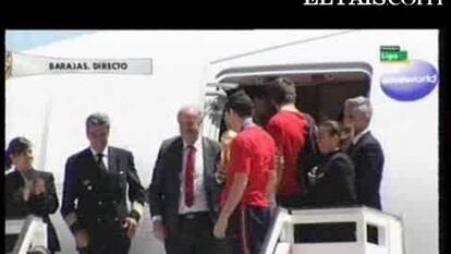 El capitán de la selección española, Iker Casillas, ha sido el primero en salir y ha levantado la Copa del Mundo al cielo de Madrid apenas aparecer por la puerta del avión junto con el seleccionador, Vicente del Bosque, y el presidente de la Real Federación Española de Fútbol (RFEF), Ángel María Villar. Momentos antes, los bomberos que han hecho un círculo de agua sobre el avión como señal de bienvenida. Tras elevar la Copa y cedérsela a Del Bosque, que inicialmente se ha mostrado reacio a recibirla, Casillas ha descendido por la escalerilla del avión con el trofeo conquistado, volviéndolo a levantar en varias ocasiones y seguido por el resto de integrantes de La Roja.