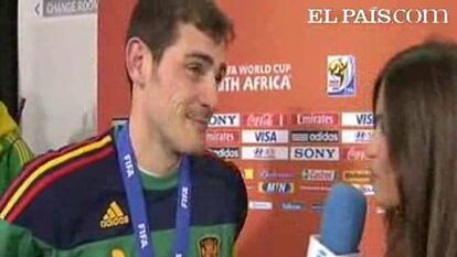 Tras acabar el partido, el capitán no ha podido evitar dar un beso a su novia, Sara Carbonero, mientras esta le entrevistaba.