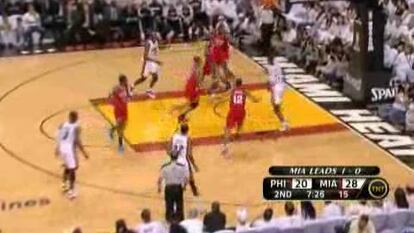 LeBron James, con 29 puntos, Chris Bosh, con 21 puntos y 11 rebotes, y Dwyane Wade, con 14 puntos, decidieron una vez más. La excelente defensa de los Heat dejó en un 34% de acierto a los Sixers. Young fue el máximo anotador del equipo de Filadelfia en el que Iguodala se quedó en 5 puntos con una serie de 2 de 8 en el tiro.