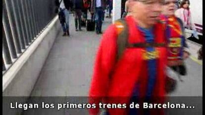 Reina la convivencia en la ciudad entre las hinchadas de ambos equipos. "5 a 0", pronostica un aficionado culé que ha viajado con 16 amigos más para ver el partido. Su objetivo, después de comer en el centro es la carpa que el Barça tiene instalada en el distrito universitario de Valencia. "Esperamos que haya un auténtico fiestón", confiesa. Como ellos, la mayoría de asistentes han llegado por carretera, pero el tren también ha jugado su papel. Renfe calcula que un 25% de los aficionados han desembarcado en AVE o Euromed, en torno a 10.000 personas. El ente público ferroviario Adif ha querido obsequiarles con pequeñas botellas llenas de agua de las fuentes de Canaletas y de la Cibeles -lugares donde las aficiones de cada uno de los equipos finalistas acostumbran a festejar sus victorias-. No es apta para el consumo, advierte y, según el manual de instrucciones, hay que echársela por encima cuando el árbitro pite el final.