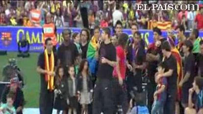 Durante la fiesta de la Champions en el césped del Camp Nou