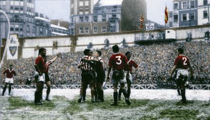 El encuentro de ida se jugó en la Catedral. Fue el famoso partido de la nieve, nombre con el que entró a formar parte de la memoria colectiva de la afición local. Impresiona ver, en el reportaje de un NO-DO de entonces que en ocasiones señaladas reproduce alguna televisión, la imagen del césped de San Mamés totalmente blanco bajo una incesante nevada. En mi colegio, el de los Escolapios, en cuyo patio aprendió a regatear y chutar el mismísimo Pichichi, había los que tenían entrada y los que lo oyeron por la radio. Entre los primeros estaba José María Arrate, futuro presidente del club (1994-2001), que había sido castigado a pasar la tarde estudiando en un aula de la planta baja y que se escapó por una ventana para no perderse el partido. Proeza que forma parte de su currículo rojiblanco. Siendo yo uno de los que aquel día no tenían entrada, creo poder afirmar que la realidad vista puede ser menos interesante que la imaginada por quien escucha, ya sea por la radio o relatada por un testigo. El reportaje de NO-DO no llega ni de lejos a transmitir una emoción comparable a la que nos hizo vivir el relato del 5-3 que registró el marcador. El primer tiempo terminó con un tranquilizador 3-0, con dos goles de Uribe y uno de Marcaida. Pero los ingleses marcaron otro par en los primeros minutos del segundo, a los que respondieron los de casa con otros dos (Merodio y Artetxe). Así habría finalizado el match de no ser por el golazo del irlandés Liam Whelan casi al final.