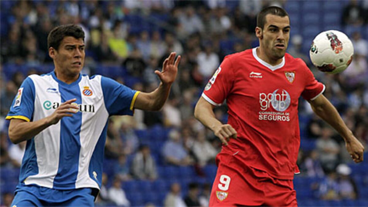 Las apariciones del Sevilla, contadísimas, nacían en las orillas, desde donde Navas y Perotti, siempre incisivos, desenmascararon la fragilidad de la zaga blanquiazul. Navas ha firmado un final de Liga estupendo y ayer demostró que apurará hasta el final sus opciones de estar en la lista para la Eurocopa. Catapultado por la frescura del extremo, el Sevilla poco a poco fue haciéndose dueño del partido y de las ocasiones. A escasos segundos para llegar al descanso, Rakitic recibió un pelotazo de Palop en la línea de tres cuartos, se dio la vuelta y puso el balón franco para la carrera de Negredo, que resolvió con facilidad ante Cristian.