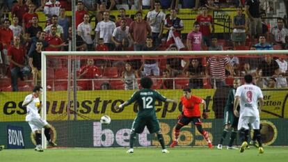 Menos de dos minutos tardó el Madrid en propiciar el partido que no quería. Un mal despeje de Iker derivó en un córner, suerte que suele condenar a los de Mourinho. Así fue. Cuatro sevillistas se emboscaron en el primer palo, Negredo hizo también de señuelo al dar un paso hacia esa zona y el lanzamiento de Rakitic cayó al boquete dejado por Di María, que estaba en las nubes. Trochowski no perdonó. Un parpadeo y el Madrid a rebufo, lo que siempre incomoda a un equipo que se sabe invulnerable con espacios, a la carrera. Fruto de ese vértigo que le caracteriza, digirió el gol como si al encuentro le faltara un minuto, no casi noventa. Se arrebató innecesariamente, lo que aplaudió el Sevilla, cómodo en un duelo en combustión, de pierna fuerte y mucho colmillo.