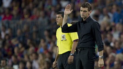 La dispersión azulgrana era absoluta. Nadie daba pie con bola. A Valdés se le encogieron los puños y Song se manejaba mejor como volante que como central. Los ausentes pesaban más que los presentes: los aficionados añoraban el desequilibrio de Tello, nadie aprieta como Pedro y ya se sabe que el equipo se disemina cuando no está Xavi, el jugador que da estilo al Barça. No había manera de ligar una buena jugada y menos de generar una oportunidad. Alguna vez, Villa atacaba el espacio, Cesc se descolgaba y se contaba algún que otro cambio de orientación de Thiago. Muy poca cosa para un equipo tan productivo como el Barcelona en el Camp Nou.