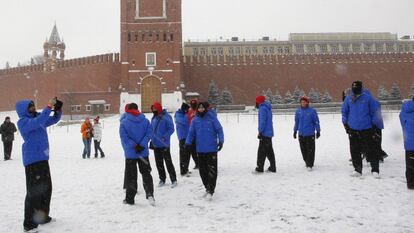 Los jugadores del conjunto granota pasean por la capital rusa antes del partido de mañana ante el Rubin Kazán