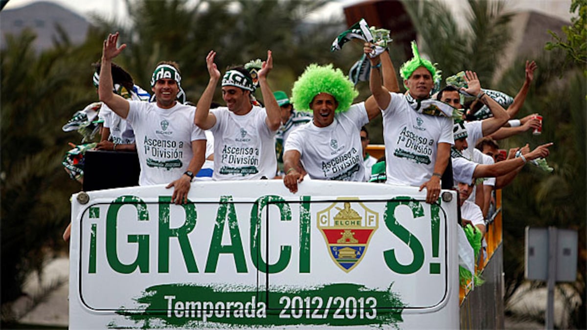 Varias tracas sonaron anunciando el paso del equipo por los barrios de la ciudad de las palmeras. Muchos llevaban de fiesta desde anoche. Chavales que en su vida han visto al equipo en Primera como José Andreu, de 19 años. “Esto es increíble, impresionante, no me lo imaginaba”, decía. Y pocos lo hicieron. El pasado agosto, tras 14 años a la deriva en Segunda División, nadie daba un céntimo por el Elche. El sueño de volver a la primera categoría del fútbol español se había truncado recientemente en una eliminatoria de ascenso contra el Granada. Su entrenador era un novato con pinta de despistado. Sus tres capitanes superaban la treintena. En las alineaciones no brillaba ningún nombre. Su presupuesto era el séptimo de la categoría. No es que nadie pensara el verano pasado que el Elche pudiera celebrar la fiesta que solo los mejores de segunda montan a final de campeonato, es que nadie les ponía siquiera en la lista de posibles invitados. “¡Y nos hemos quedado solos!”, decía un grupo de jóvenes.