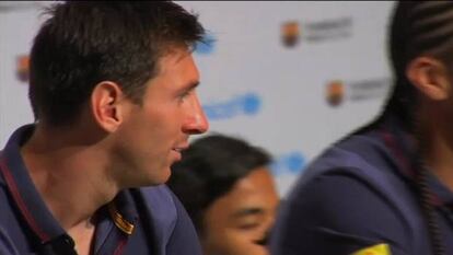 Leo Messi, acompañado de José Manuel Pinto y del directivo Ramon Font, compareció ayer en un acto organizado por la Fundación del Barcelona y Unicef con niños afectados de discapacidad psíquica. 600.000 niños en Tailandia padecen algún problema de ese tipo y viven en alto riesgo de exclusión social. Pese a los problemas de comunicación por el idioma, Messi, embajador de Unicef, se mostró cercano y cariñoso con los asistentes. En el acto, los niños le hicieron preguntas a Leo, a los que explicó, entre otras cosas, que lo más importante para llegar a ser un jugador de futbol es el esfuerzo: “Cuando te planteas un objetivo es imprescindible la lucha y el sacrificio”.