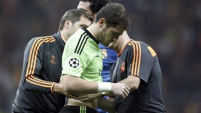 Hacía ocho meses que Casillas no disputaba un partido oficial con el Madrid. En total, 238 días desde que Arbeloa, otro compañero, le fracturara una mano de una patada en Mestalla. La insólita rotación de Ancelotti le dio la titularidad en la Champions. Pero Casillas no pudo disfrutar. Todavía estaba frío cuando despejó un balón fuera de banda y llamó a los médicos. Le examinaron, le vendaron y luego pidieron el cambio. Pepe y Riera se acercaron a animarle mientras se retiraba lastimado. El público le dedicó una ovación mientras le daba un abrazo a Diego López y se retiraba.