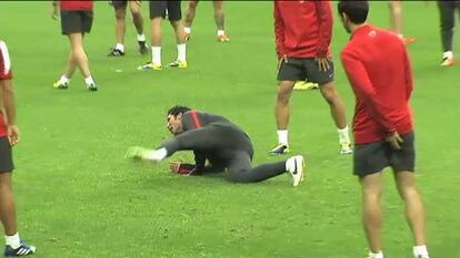 Bajo la fina lluvia, Simeone quiso comprobar de primera mano el estado de sus futbolistas ante las dudas que dicen asaltarle en el centro del campo. Se metió en uno de los rondos y lo agitó. Sin Mario Suárez, que se quedó en Madrid aún convaleciente de la rodilla derecha, el técnico medita si continuar con Tiago como pareja de Gabi. Las prestaciones del portugués en el derbi fueron sobresalientes y es uno de sus jugadores con más experiencia en la competición, pero se duda de si su físico será capaz de aguantar dos partidos seguidos tan exigentes. Ahí es donde entran Guillavogui, e incluso del Cebolla Rodríguez, que vuelve a Oporto, si decide que sea Koke la pareja de Gabi. Tampoco puede contar Simeone con Diego Costa, que cumple su último partido de sanción. Raúl García apunta a jugar por detrás de Villa. Sobre El Guaje reflexionó Simeone cuando le preguntaron cómo estaba viendo su adaptación y qué puede aportar en este tipo de citas: “Es un jugador con jerarquía, el que más acostumbrado está a este tipo de partidos y el que ha ganado más títulos importantes. Eso lo pone en lugar determinante dentro del equipo y del juego. Lo que más me sorprende de él es el esfuerzo que pone de cara a lo que necesita el equipo. Los goles le llegarán”.