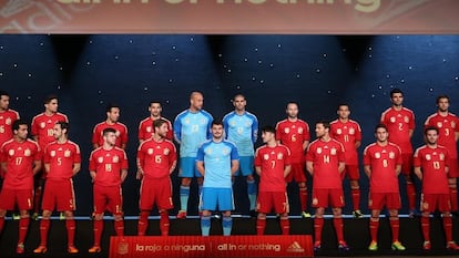 Los 23 hombres convocados por Vicente del Bosque para los dos próximos compromisos amistosos de la selección española de fútbol ante Guinea Ecuatorial y Sudáfrica los días 16 y 19 de noviembre han presentado esta mañana la equipación para el próximo Mundial, que se disputará el próximo año en Brasil. La principal novedad serán los pantalones, que dejarán de ser del habitual color azul para lucir el mismo tono rojo de la camiseta, con algunos detalles dorados.