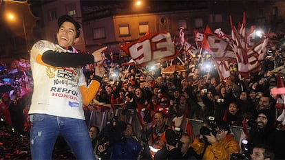Bajo una persistente lluvia, unos mil aficionados siguieron en directo la llegada de los hermanos Márquez y los miembros de su equipo que le acompañaban. En el escenario, y a los compases de We Are the Champions, el propio Marc animó la fiesta al grito de: “¡Qué bote Cervera!”. “No sé qué es lo que tengo que hacer ahora para volver a tener un recibimiento así. El tiempo no ha acompañado, pero vuestra respuesta es extraordinaria”, agradeció el piloto. “Un título así se tiene que celebrar bien, porque siempre cuesta mucho conseguirlo y también es un poco suyo”, añadió el catalán, que se convirtió el pasado domingo en Valencia en el piloto más joven en conseguir la corona de MotoGP.